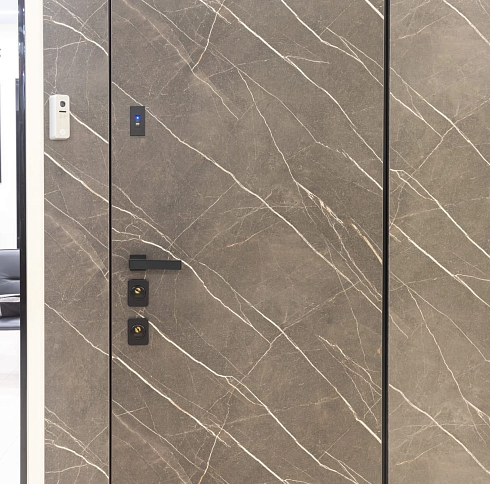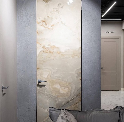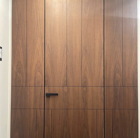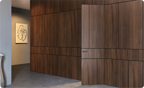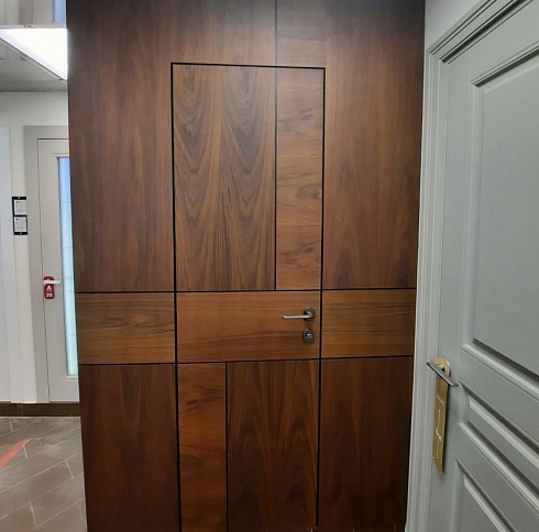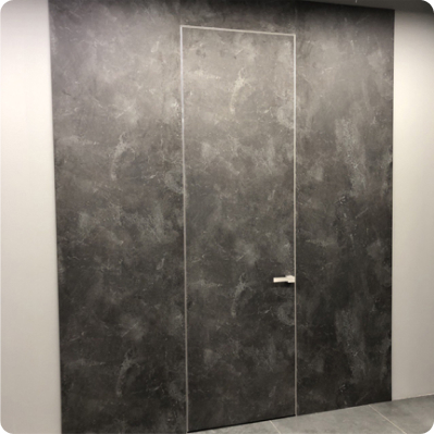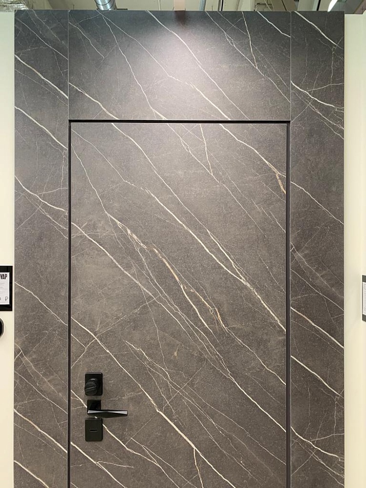 Современно и эстетично. Добавить графичности или сделать акцент именно на скрытой двери помогут современные отделки, например, шпонированные панели или оформление антивандальным материалом с имитацией природного камня. Бонус - возможность изменения облика в соответствии с новыми требованиями интерьера.