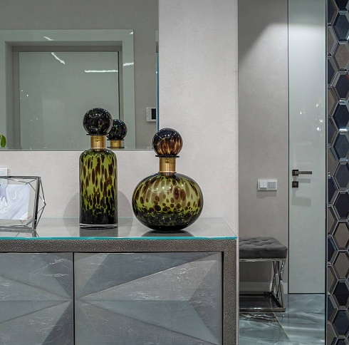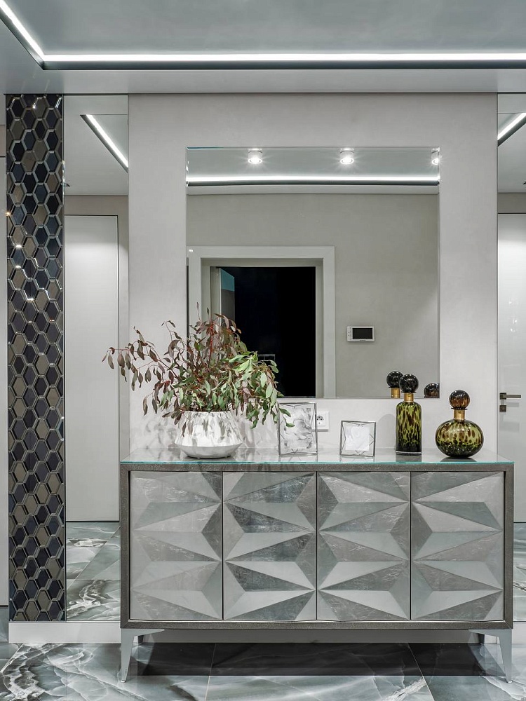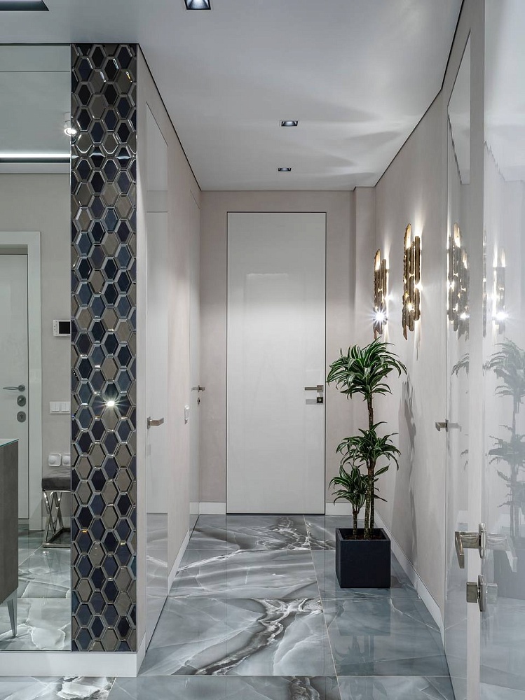 Лёгкость и изящество в каждой детали. Скрытые двери со стеклом разгружают интерьер, способствуют