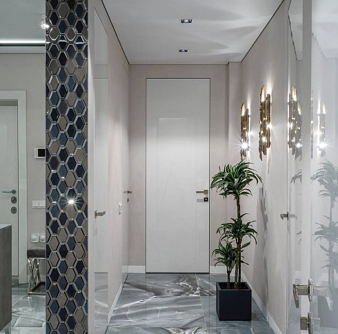 В производстве дверных полотен распространены стеклянные, пластиковые и металлические материалы. Использование зеркал и отражающих поверхностей рассеивает свет, что позволяет визуально увеличивать площадь квартиры.